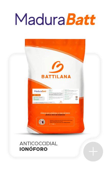 Madurabatt (maduramicina de amonio al 1%) es un anticoccidial ionóforo monovalente glicósido empleado en el control de la coccidiosis causada por los tipos más frecuentes de Eimeria en aves, en especial E. tenella.